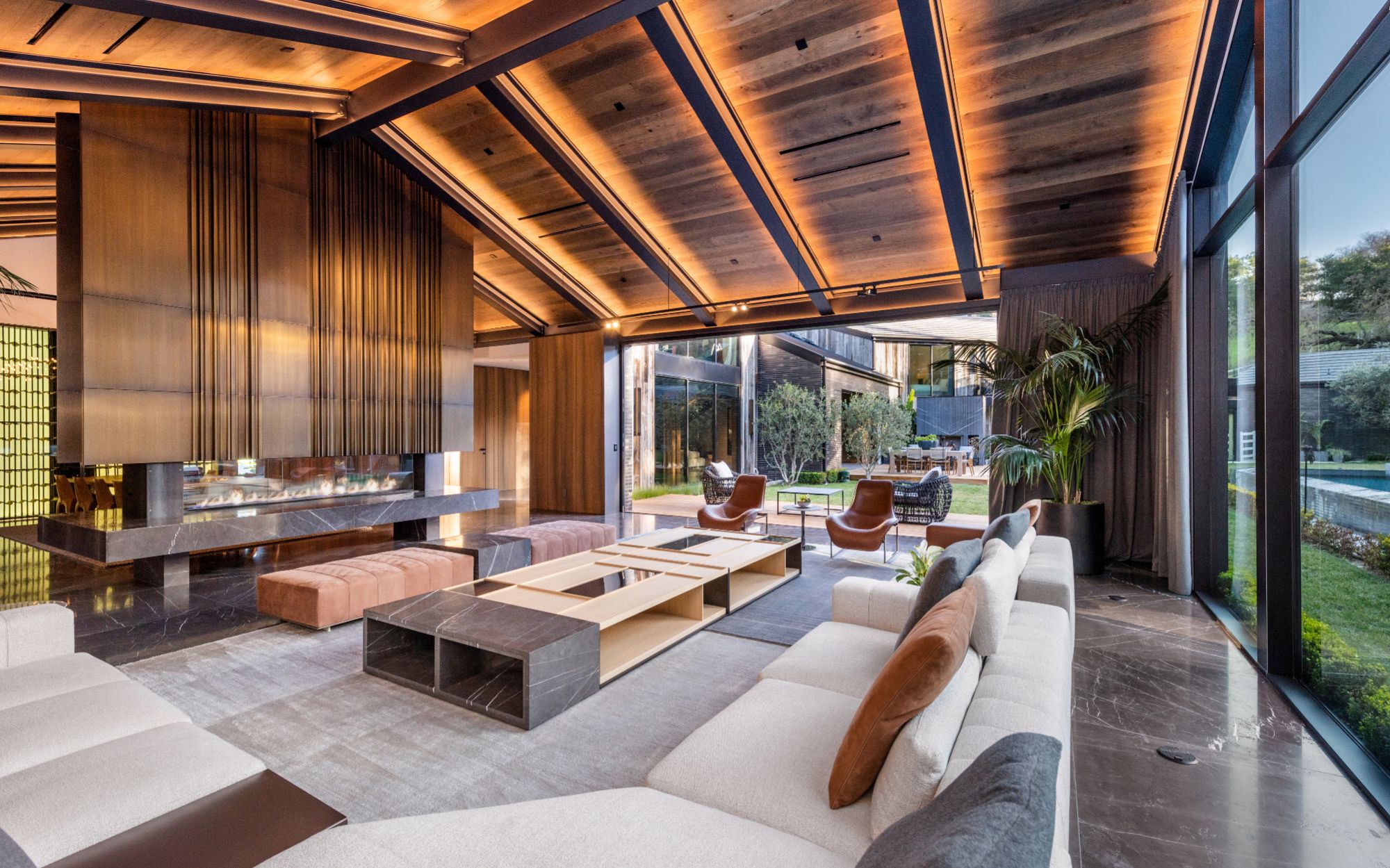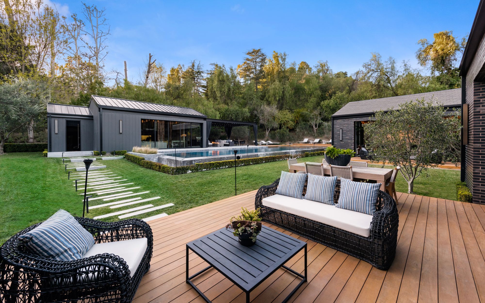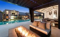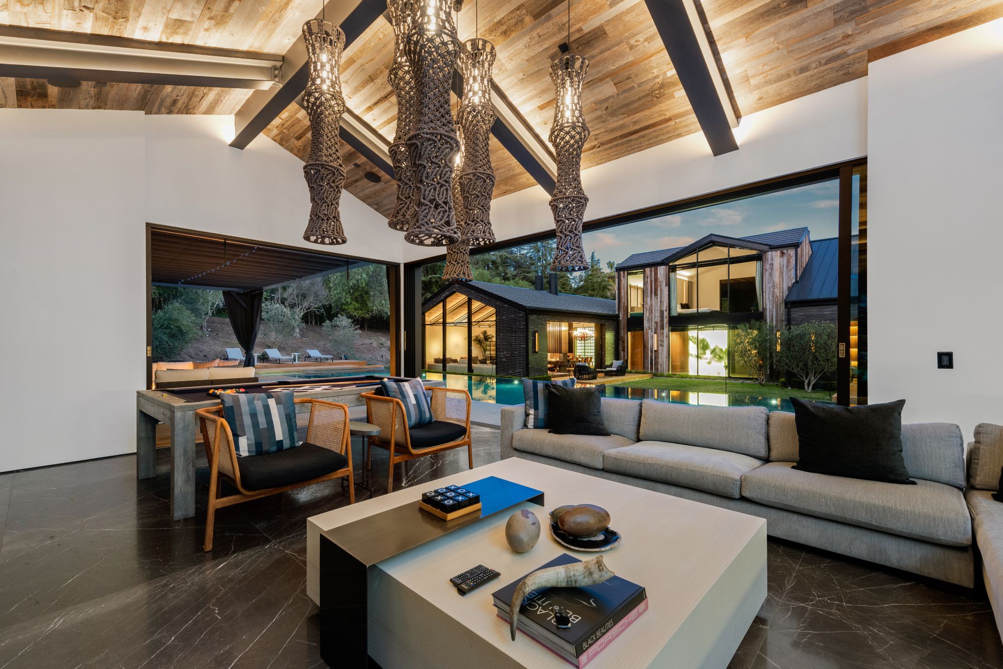 Escape to your own modern farmhouse retreat in the exclusive guard-gated community of Hidden Hills. Designed by Nobel LA in 2021, this home sits at the end of a private cul-de-sac and is surrounded by lush landscaping for ultimate privacy. Enter the formal dining room lined with Pietra marble floors, two custom chandeliers designed by Preciosa Lighting, and a custom brass floating fireplace that separates the living room. The professional grade chef's kitchen sits behind the floor-to-ceiling wine display. State-of-the-art amenities include a home theater and fitness/music studio. The expansive great room features double vaulted ceilings, panoramic windows and opens to your own backyard oasis with a 65' pool and spa. Dine al fresco on the patio or poolside under the cabana with indoor sitting area/game room, bathroom, built-in BBQ, firepit, and video wall. Stunning primary suite offers fireplace with sitting area, designer walk-in closet, and spa-like bathroom with dual chiseled stone vanities, steam shower, and soaking tub. 4 additional guest suites and separate staff quarters provide plenty of space. Detached guest house with kitchenette, walk-in closet, and plunge pool. 4-car garage and motor court offer ample parking. Live in luxury with the best amenities at this entertainer's paradise.